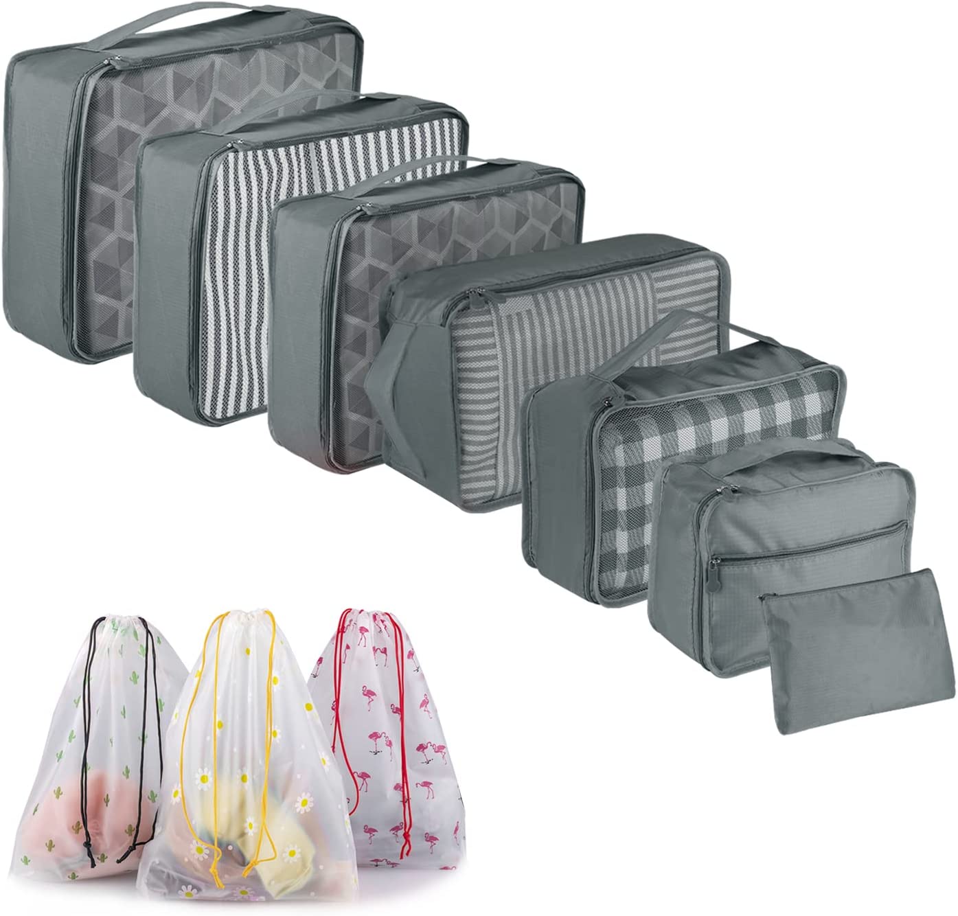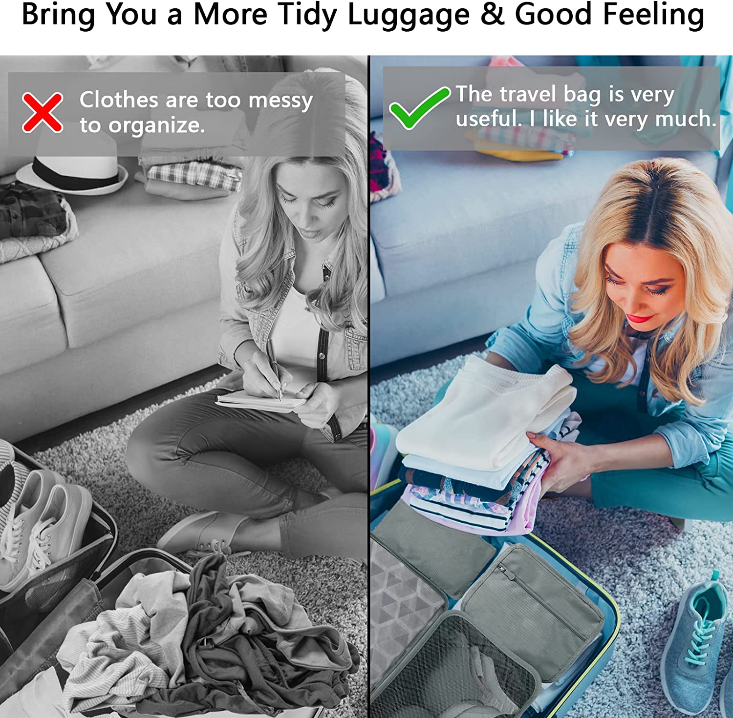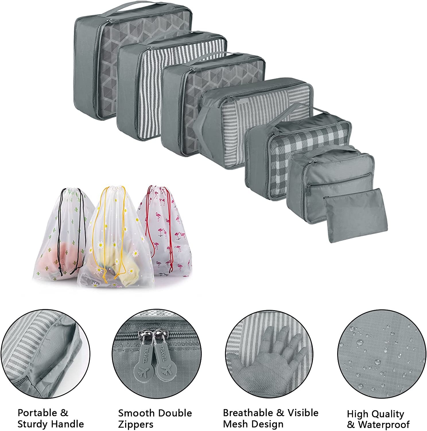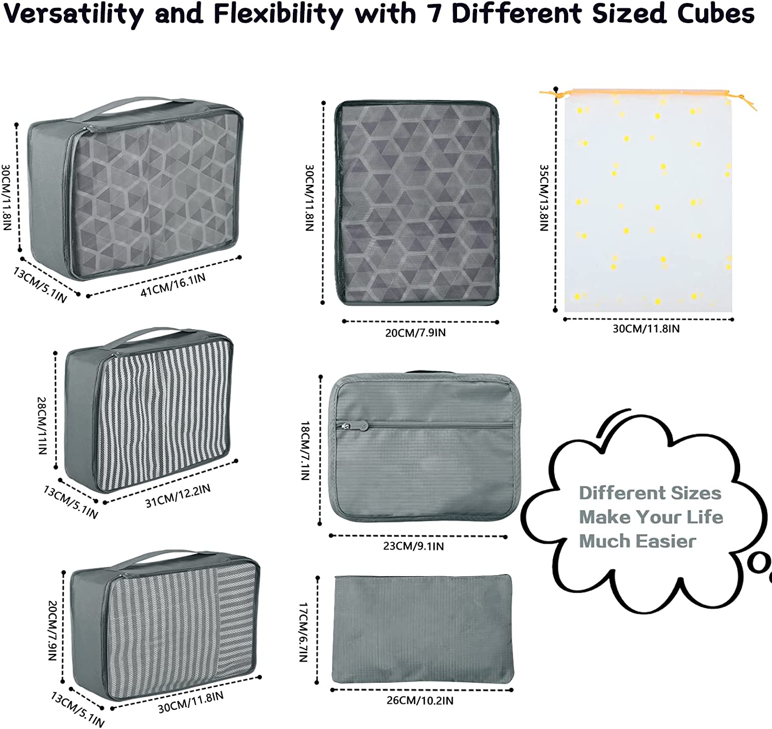 - packing cubes can simplify your travel life and keep you in a happy mood and convenient for luggage storage on the way. Large capacity space can meet all your storage needs and travel needs. The excellent material is more durable and waterproof. The breathable visual screen window can well identify the items placed. Different sizes can meet your different storage requirements, make better use of travel bags and reduce the burden of travel!Dimension Description: Large clothes bag (2): 41cm / 16.1in x 30cm / 11.8in x 13cm / 5.1in Medium size clothes bag: 31cm / 12.2in x 28cm / 11in x 13cm / 5.1in Small underwear bag: 30cm / 11.8in x 20cm / 7.9in x 13cm / 5.1in Shoe bag: 20cm / 7.9in x 30cm / 11.8in x 13cm / 5.1in Wash bag: 23cm / 9.1in x 18cm / 7.1in x 11cm / 4.3in Parts package: 26cm / 10.2in X 17cm / 6.7in Drawstring Bags (3): 30cm / 11.8in x 35cm / 13.8inFriendly Reminder: – The dimensions are measured manually and please allow slight deviation. – Due to different lighting and screen settings, please allow a small chromatic aberration.