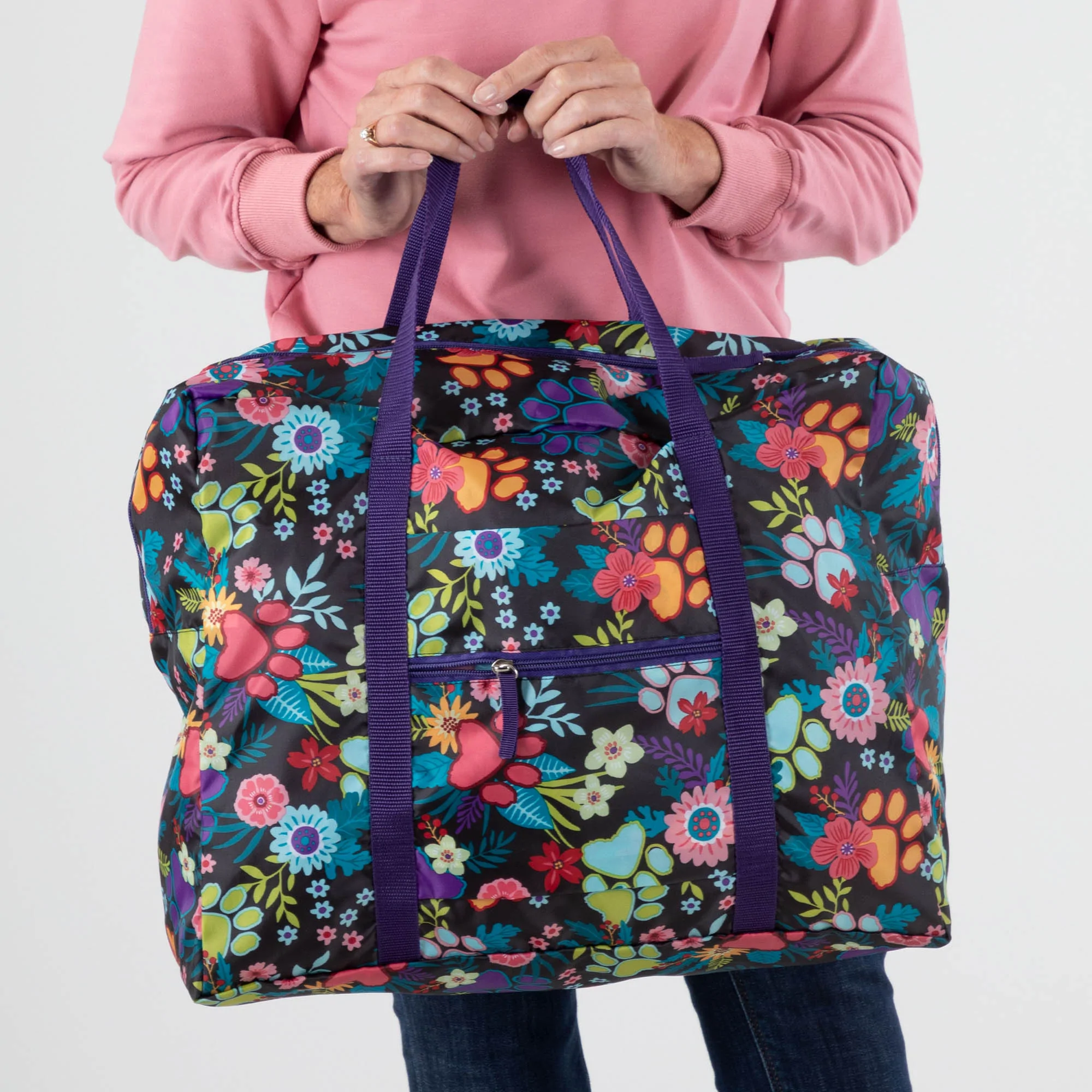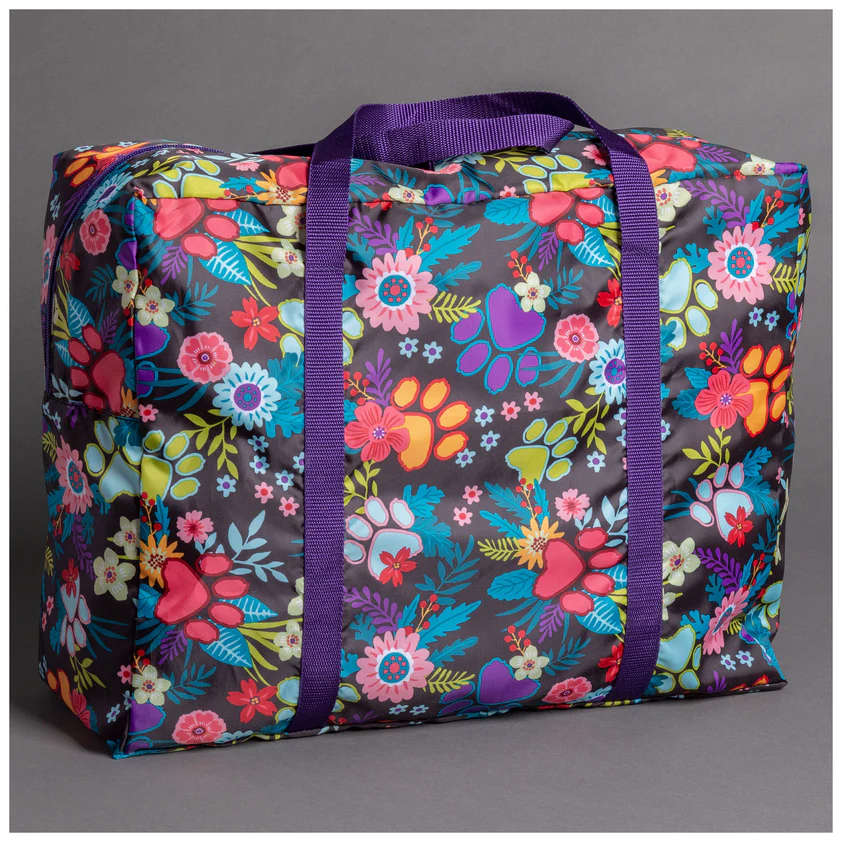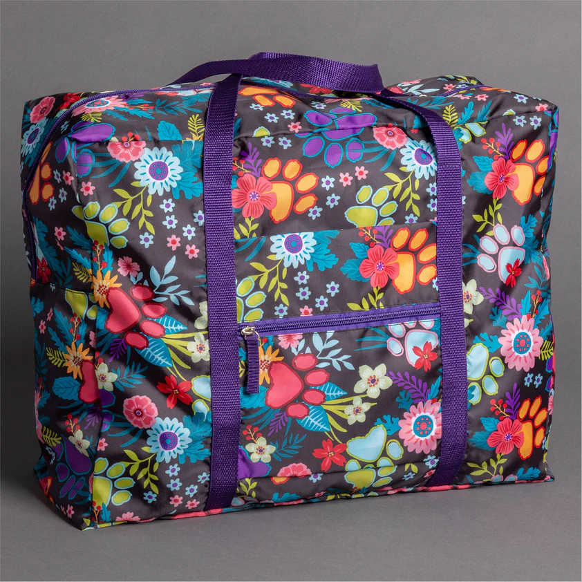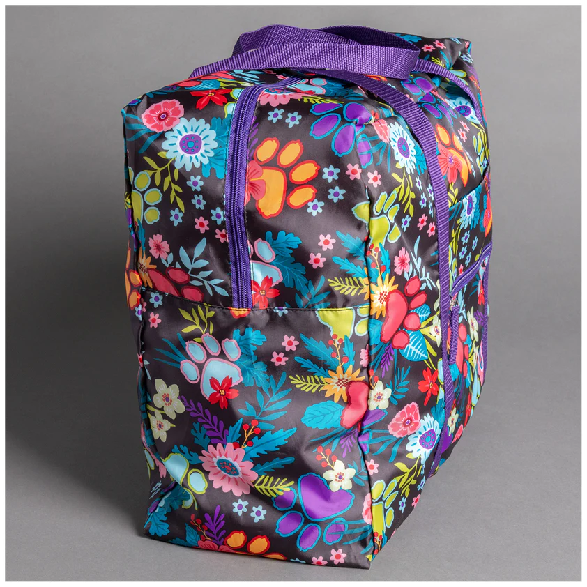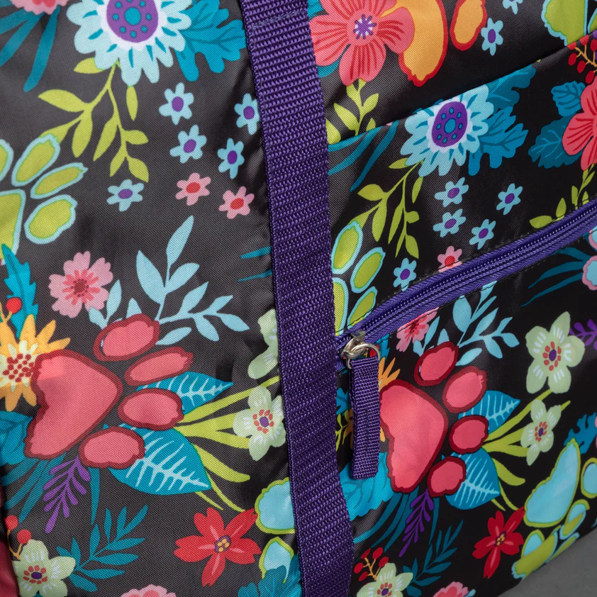 Flowers and leafy greenery swirl in a garden of paw prints in this wildly colorful duffel! Made with a spacious interior and an easy to zip top, this super lightweight polyester duffel also features a convenient front pocket, and a slide through feature to attach it to your rolling suitcase.