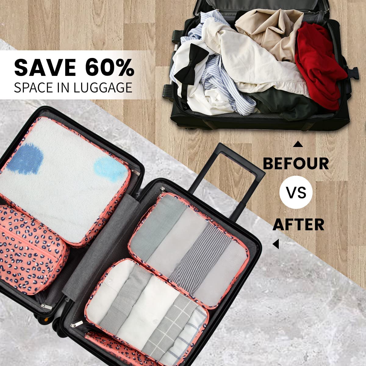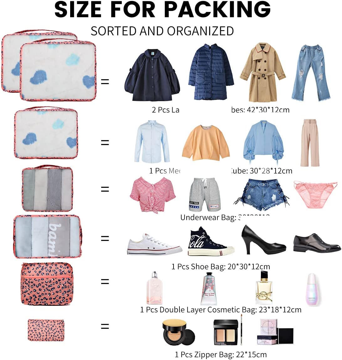 Your suitcase only needs these 10 pieces different sizes packing cubes to store all your carry-on item. High quality and durable, value set for travel. And you can use different color luggage packing organisers to distinguish between different family members’ luggage. How To Care For Your Packing Cubes: ✔Hand washing cubes is the best way to ensure the cubes do not get damaged ✔Wash only with cold water ✔Hang dry only ✘DO NOT put the cubes in the washing machine, even if it is on gentle ordelicate cycle ✘DO NOT put fabric conditioner of any kind 10 Pieces Packing Cubes Contain: 1. Packing Cube: 42*30*12cm (coat, sweater, sweater, blanket, bath towel and other large items) 2. Packing Cube: 42*30*12cm (dress, half skirt, pants and other spring and autumn thin clothing;) 3. Packing Cube: 30*28*12cm (T-shirt, shirt, scarf, etc;) 4. Underwear Bag:30*20*12cm (bra, vest, underwear, etc;) 5. Shoe Bag: 20*30*12cm (slippers, shoes, socks, etc;) 6. Double Layer Washing Bag: 23*18*12cm (toiletries, emergency medicine, etc;) 7. Drawstring Bag: 30*20cm (electronic equipment such as data cable and earphone;) 8. Drawstring Bag: 30*20cm (cosmetics, toiletries, etc;) 9. Drawstring Bag: 30*20cm (dirty or wet clothing, etc;) 10. Zipper Bag: 22*15cm (Headphones, data cables, etc.)