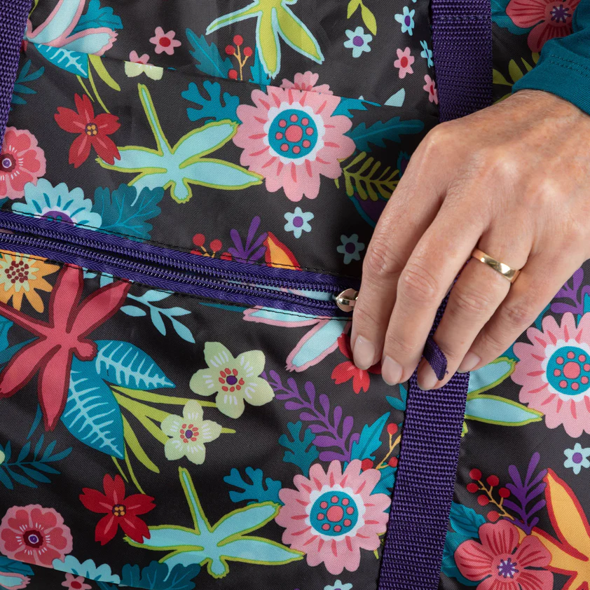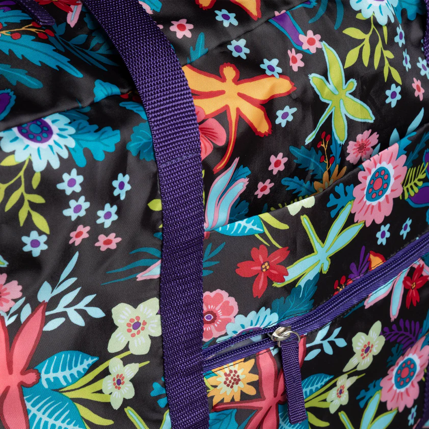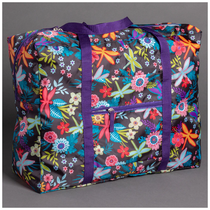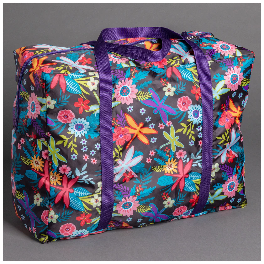 Flowers and leafy greenery swirl in a garden of floating dragonflies in this wildly colorful duffel! Made with a spacious interior and an easy to zip top, this super lightweight polyester duffel also features a convenient front pocket, and a slide through feature to attach it to your rolling suitcase.