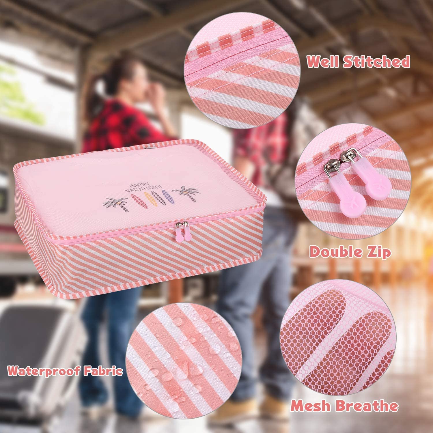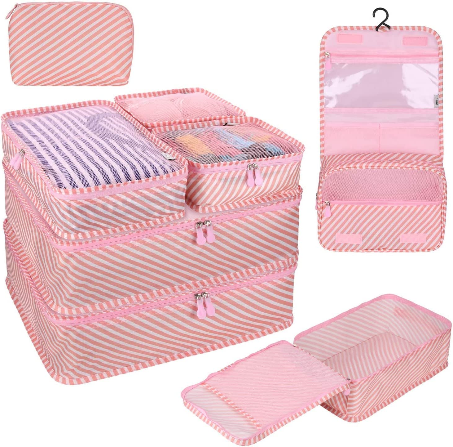 - Super Value Square Travel Bags Set: Include 5 pieces travel cubes for clothes (2 Large, 1 Middle, 2 Small), 1 big shoes cube, can hold at least 2 pair of shoes, 1 big toiletries bag for your toiletries, makeup, necklace, earring and so on, part mesh design, more breathable and clean. 1 USB cable bag for electronics and accessories. 8 pieces packing bags make your luggage neat and order, make you have a easy, comfortable travel experience.