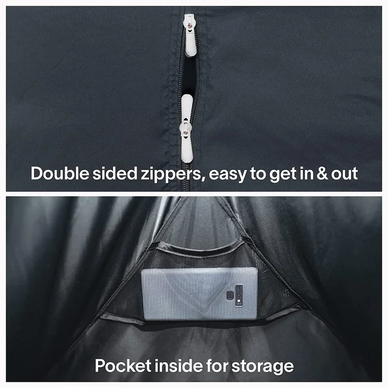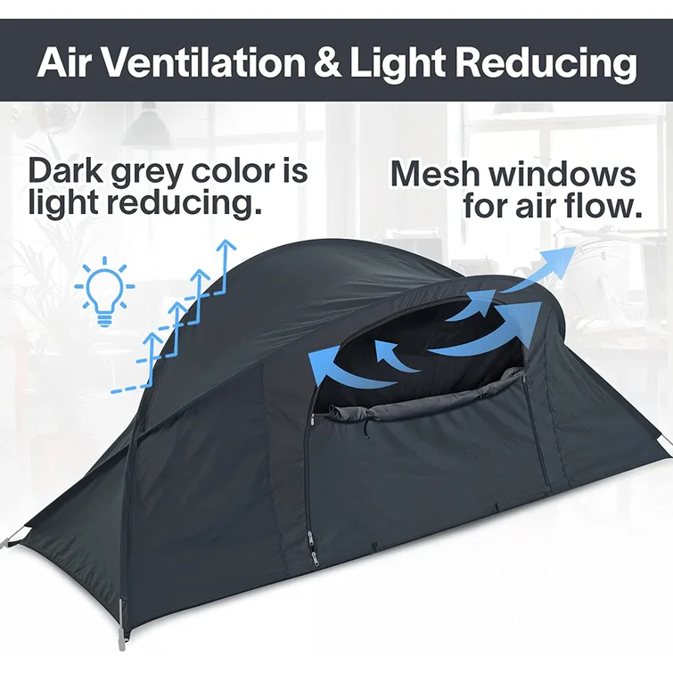 - The innovative design increases this bed tent’s stability and roomy inner space. High-quality pongee fabric is breathable and soft. The dark gray color is light-reducing and allows you to see out, but no one to see in. One large double-sided zipped door makes it easy to get in & out. Mesh windows can provide airflow and wanted light.