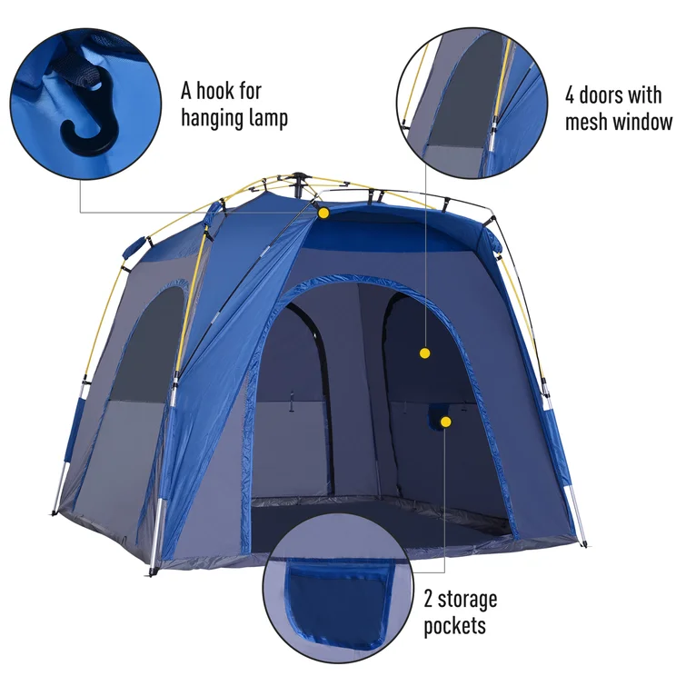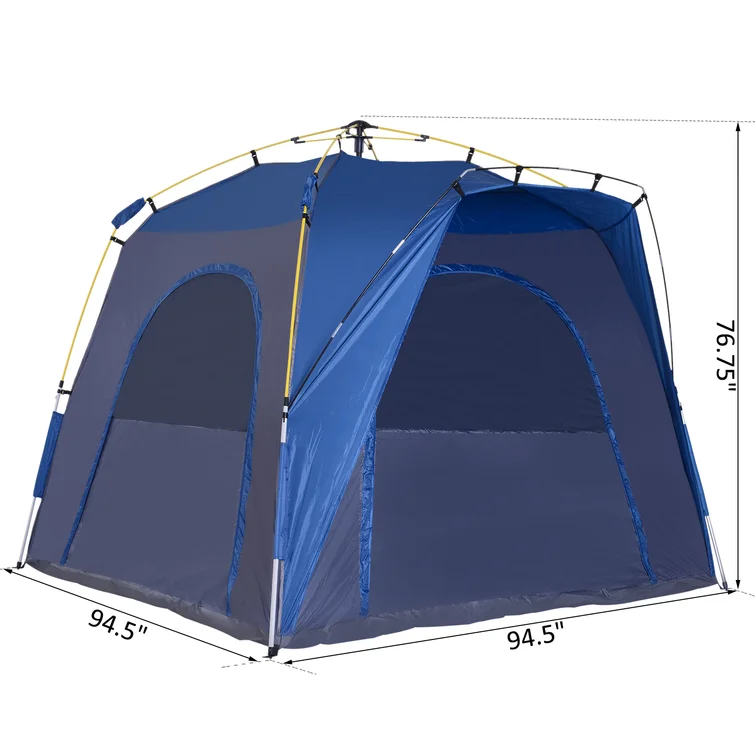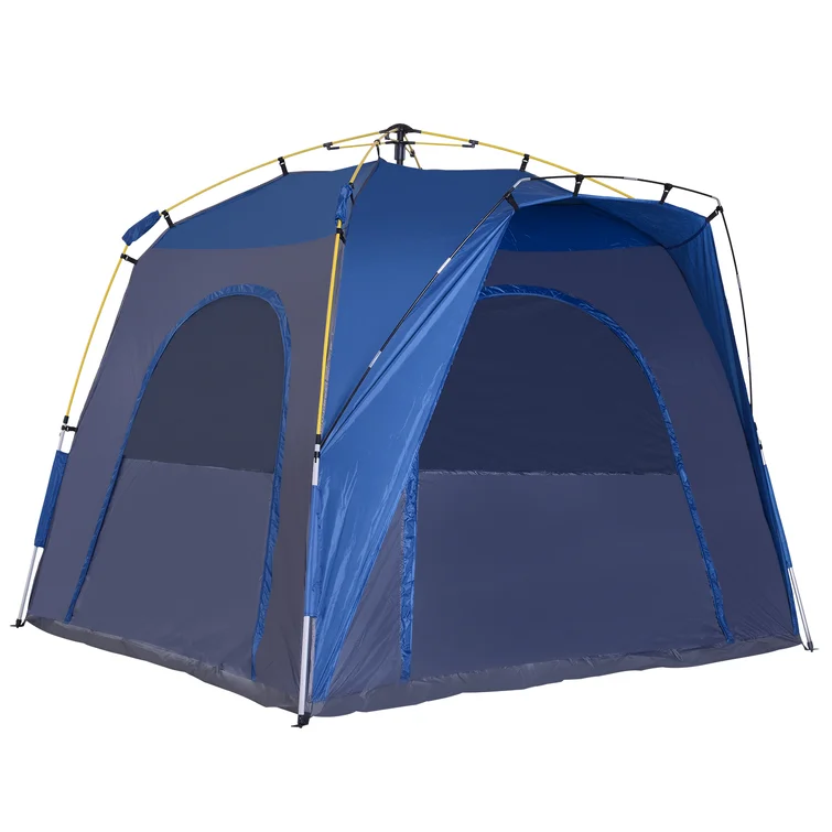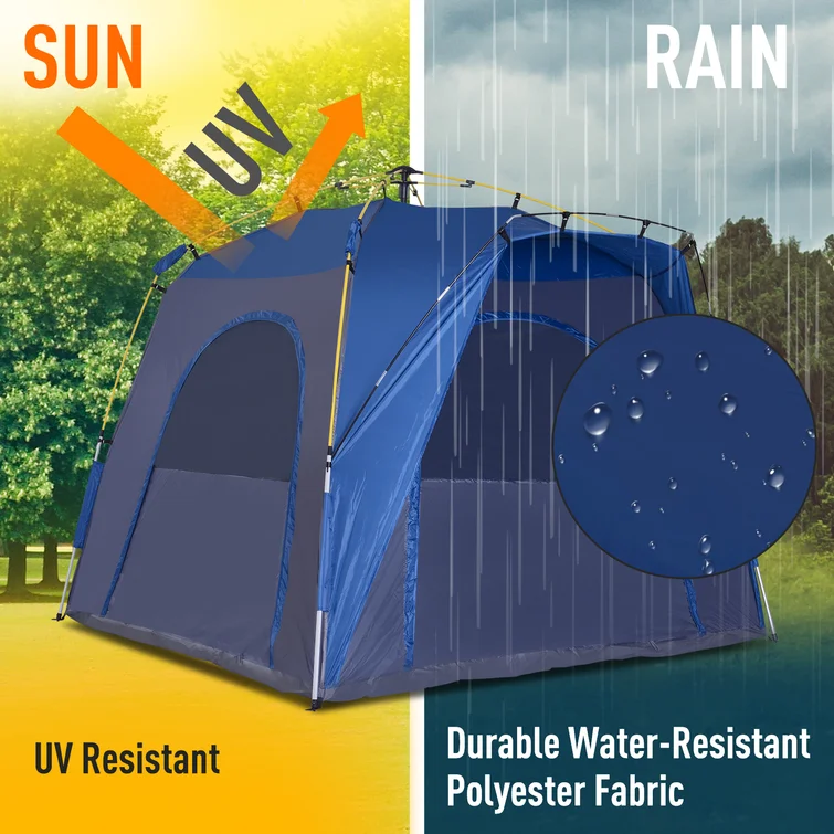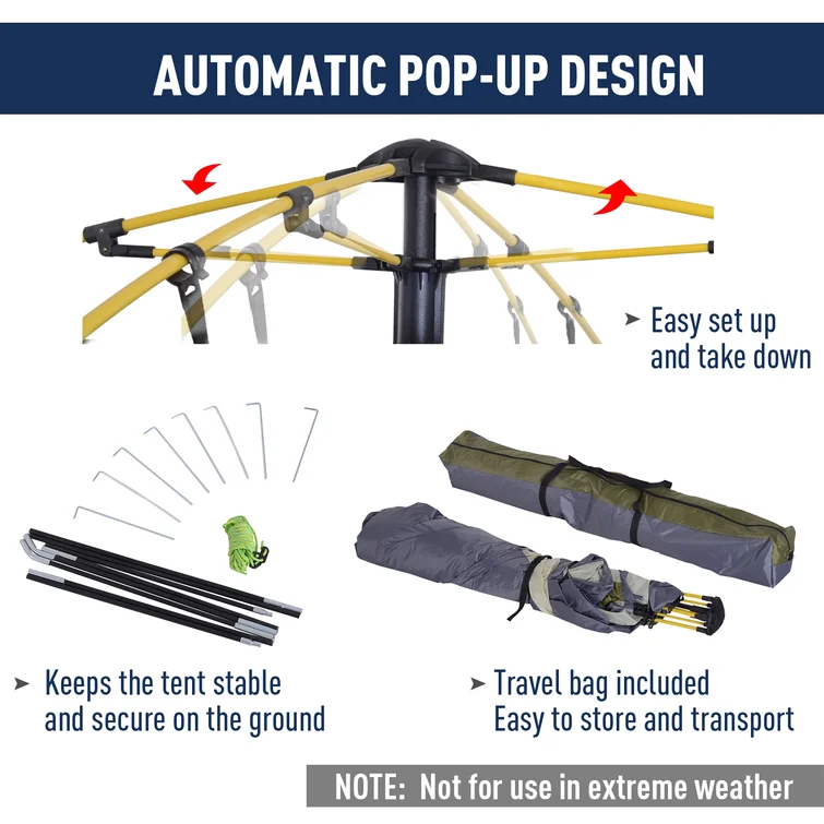This Hydraulic Pop-Up Camping 5-Person Tent is perfect for day trips, overnight, and any beginner-level backpacking trips. It features a spacious interior area and is built from rugged materials, including a front rainfly that can double as a sunshade. With pre-attached poles, it is easy to unfold and extend this tent into a fully operational shelter! Just push the button at the apex of the tent to collapse it for storage or transport.