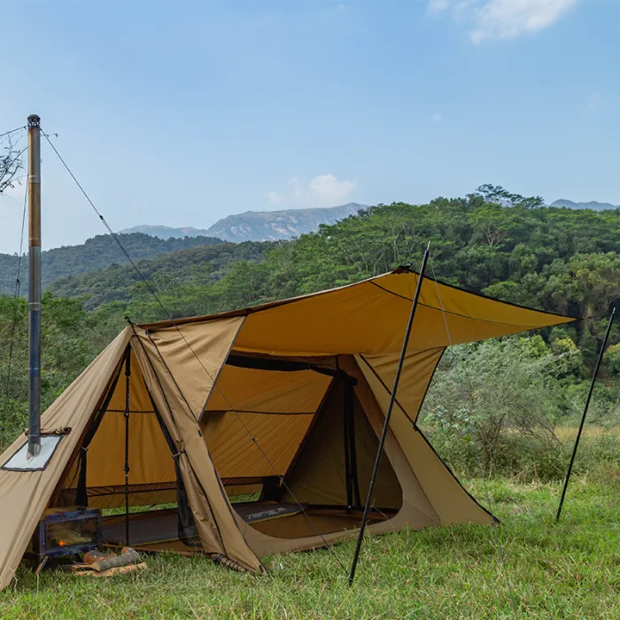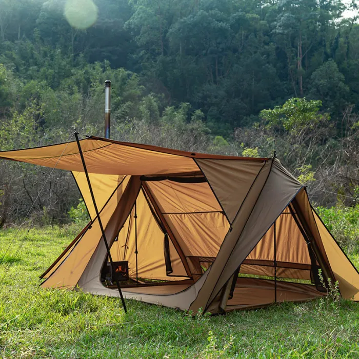 - we can close the vent in the cold weather to keep the temperature inside the hot tents. The outer walls of the vents are made of double-layered fabrics and reinforced with waterproof glue to enhance the waterproofness of the tent’s seams. Two waterproof glues are added to the front and back of the top ridge of the hot tent for sale to further enhance the waterproof performance. In addition, we added two guy-line points in the stove area to improve wind resistance while preventing snow from gravitationally squeezing the best hot tents surface and touching the stove. (For more upgrade information, please read the detailed description below)