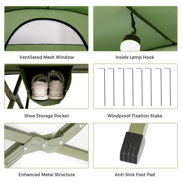 - Elevated Cot: Including a tent and a sleeping cot, an outdoor camping tent can be used in combination or separately. Besides, an elevated cot with a heavy-duty metal frame can hold up to 660lbs.